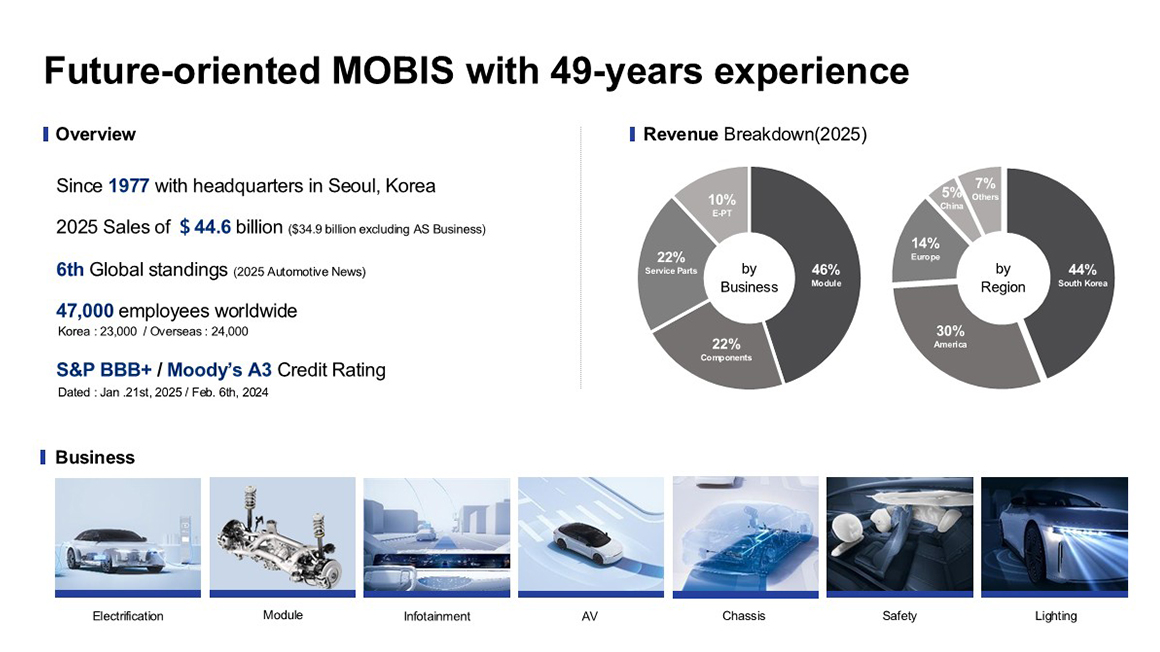 Mobis pioneers the new era of mobility by engineering advanced integrated systems that harmonize core vehicular architectures with intelligent safety and convenience technologies. Leveraging deep industrial expertise and an innovation-first mindset, we deliver high-performance solutions that redefine the global automotive landscape.