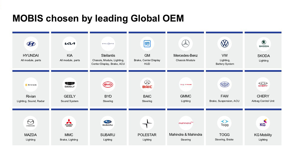 MOBIS manufactures the three core modules required for vehicle assembly, plus separate driver safety and convenience group components.